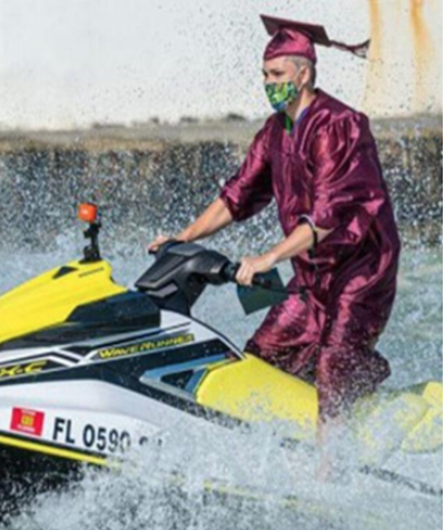 SENIORS AT SOMERSET ISLAND PREP, in Florida, graduated in style—on jet skis! Thanks to a local business that allowed the students to use their jet skis to help celebrate this milestone, the students received lessons prior to their big day and then jet skied in front of Key West’s Southernmost House wearing their gowns and masks—where the principal stood on the dock to hand out their diplomas.