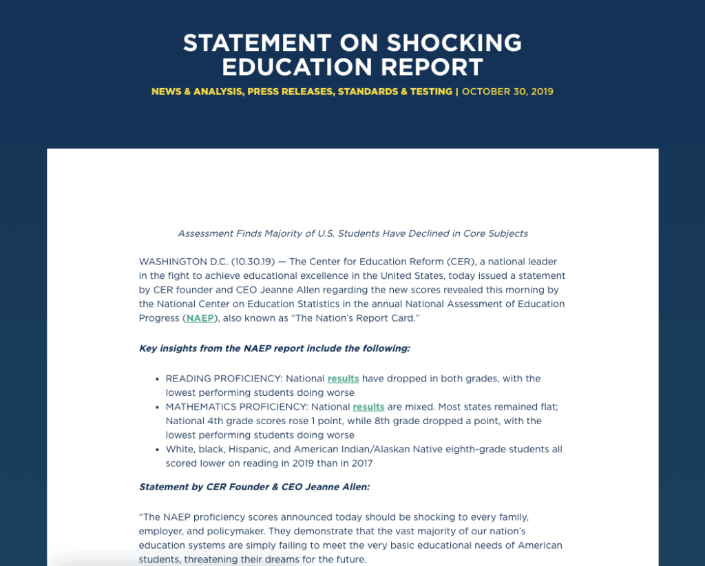 “This record plunge on NAEP scores is a continuation of bad education policy, pandemic or not,” said Jeanne Allen, Founder and CEO of the Center for Education Reform (CER).